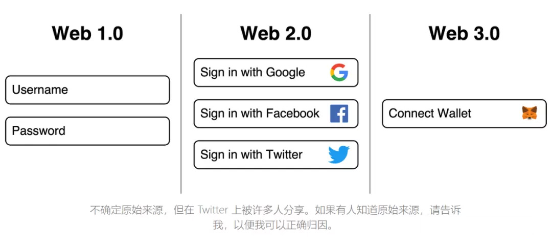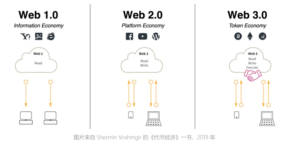 这张图显示了从功能角度的演变,从 Web 1.0 中的只读到 Web 2.0 中的读 + 写,然后到达允许读 + 写 + 执行的 Web 3.0。简而言之,从消费内容到创建内容,最后到拥有内容的转变。